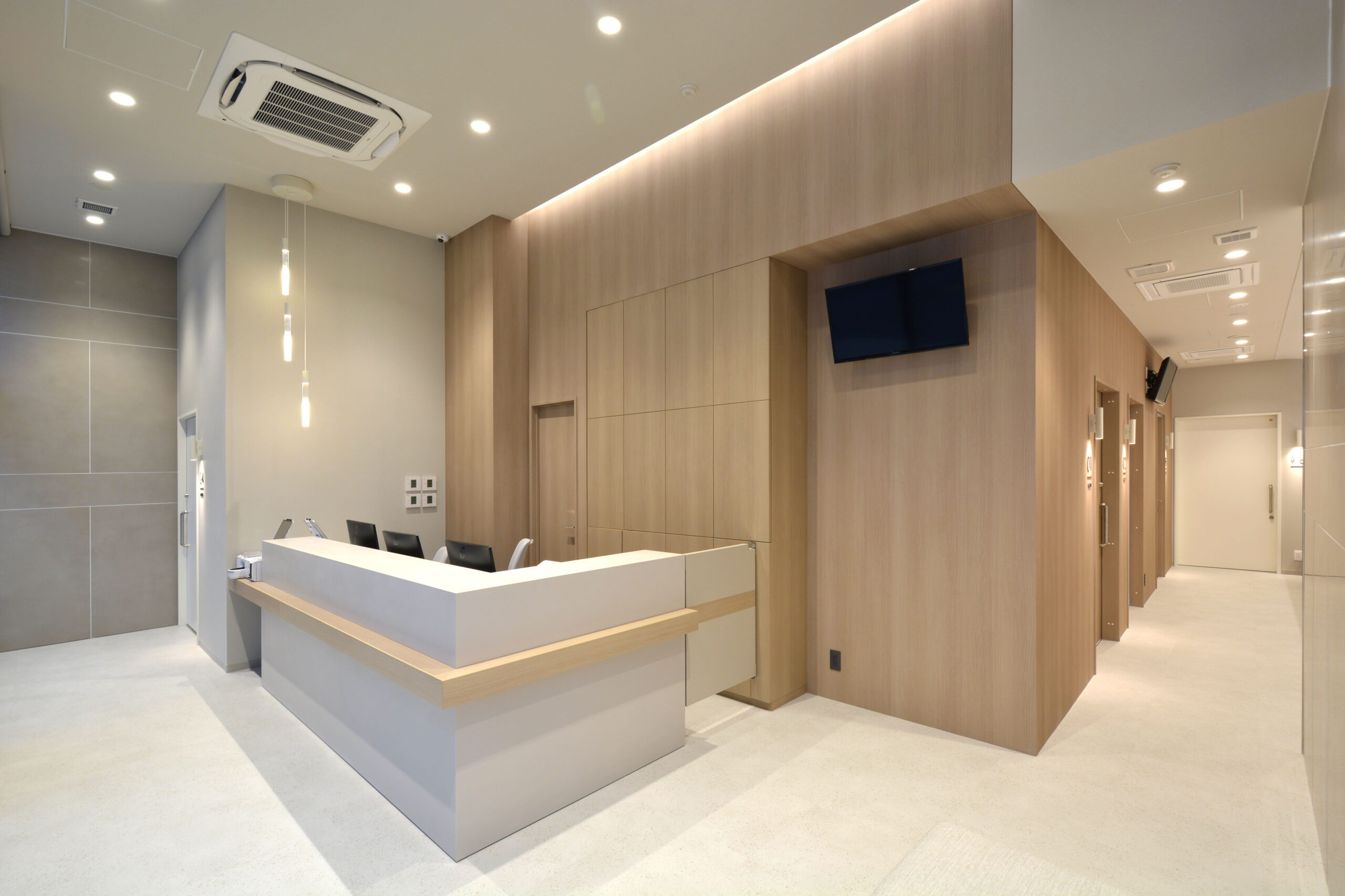 受付は天井の高さを生かして、開放的で明るい空間になっています。