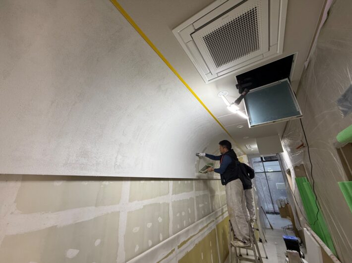 まずは下地ボードのビス頭やジョイント部分をフラットにするための下地処理を行っています。