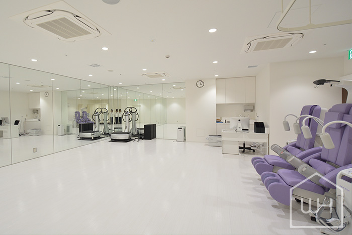 こちらはリハビリ室です。ミラー貼りの広々した空間です。