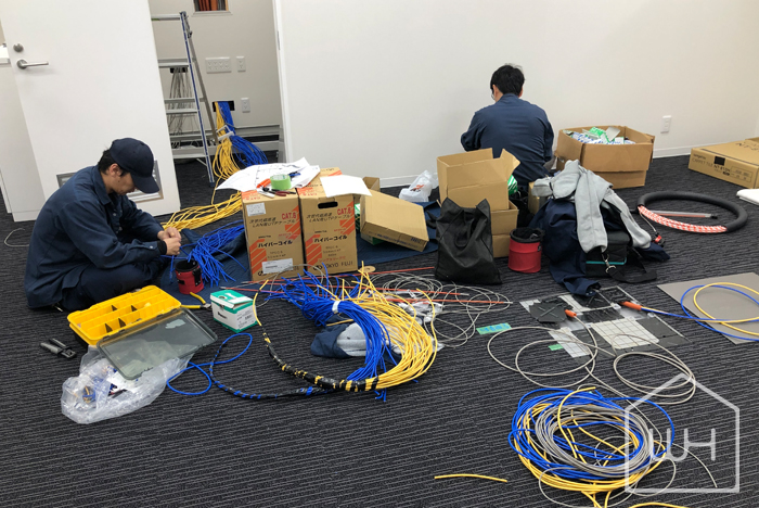 今回はサーバルームも設けてラックも用意。ケーブルには番号も振って整理しやすくしておきます。