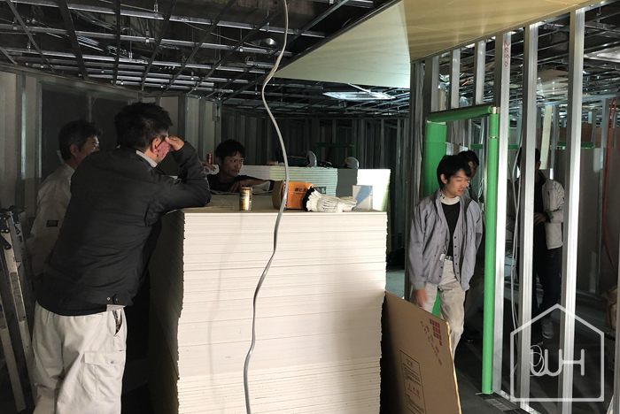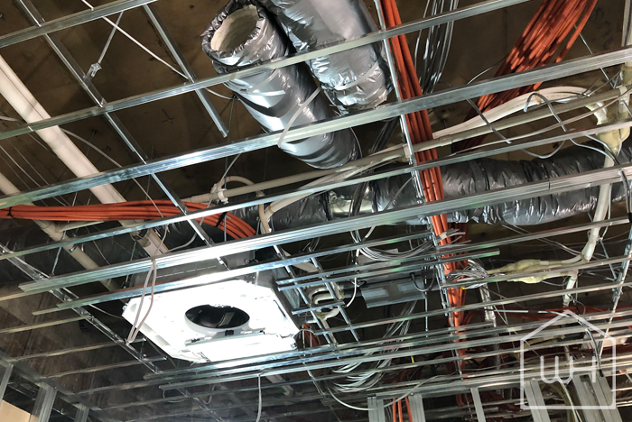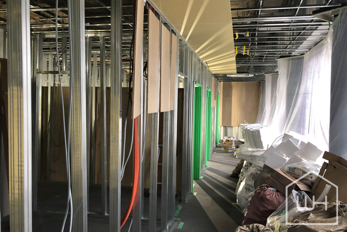 こちらは天井・壁の下地工事の状況です。LGS(軽量鉄骨)という材料で骨組みを構成してゆきます。