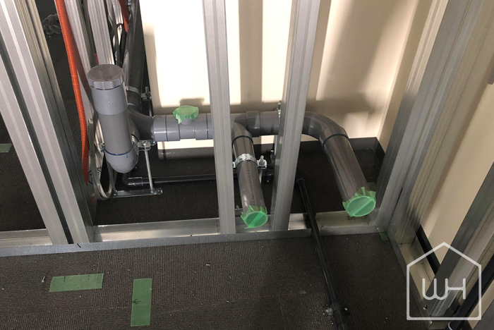 壁内に排水管を配管しています。排水はトラブルが多いので勾配がしっかりとれるように丁寧に施工します。