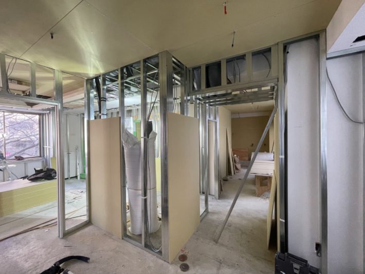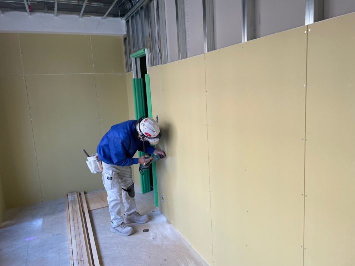 鋼製の下地組が終わったらそこに石膏ボードを貼ってゆきます。