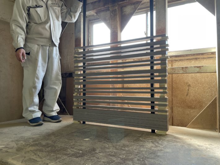 今回の特徴的なアイテムとなる格子パーティション。格子の隙間のバランスがとてもデリケートなので何度もシミュレーションして決めました。