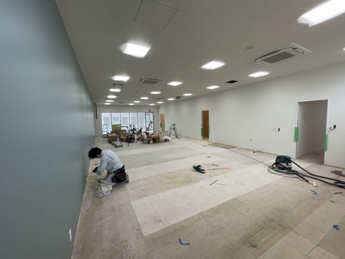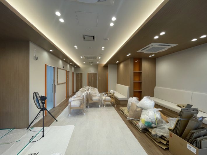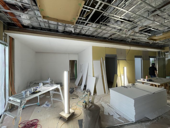 間接照明や家具類も搬入されて完成間近です。つづきはまた次回!