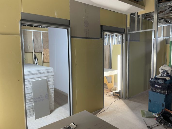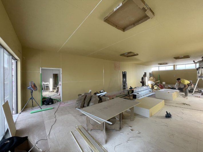 LGSの軸組が完成したら、そこに石膏ボードやケイカル板などを貼ってゆきます。