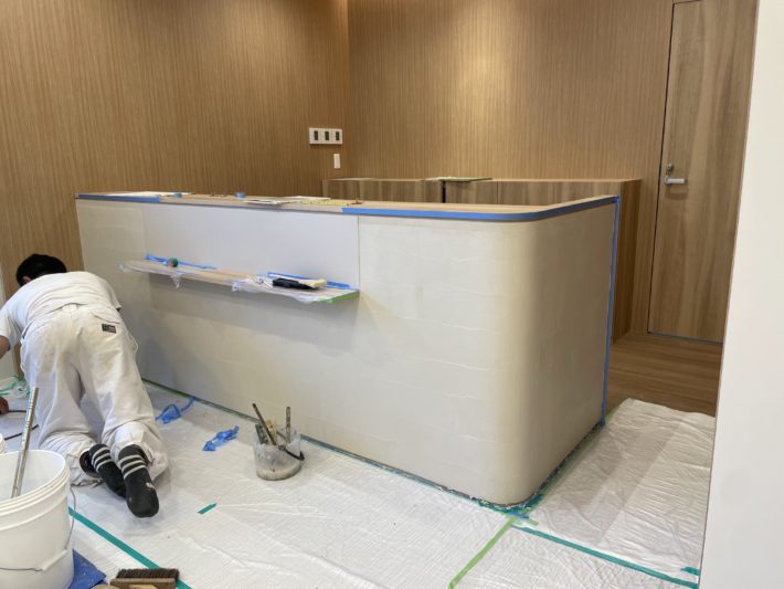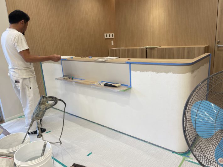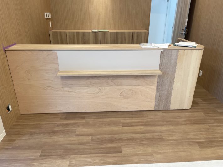 ほぼ完成に近づいてきましたが、最後のこだわり箇所である受付カウンターの仕上げ工事です。