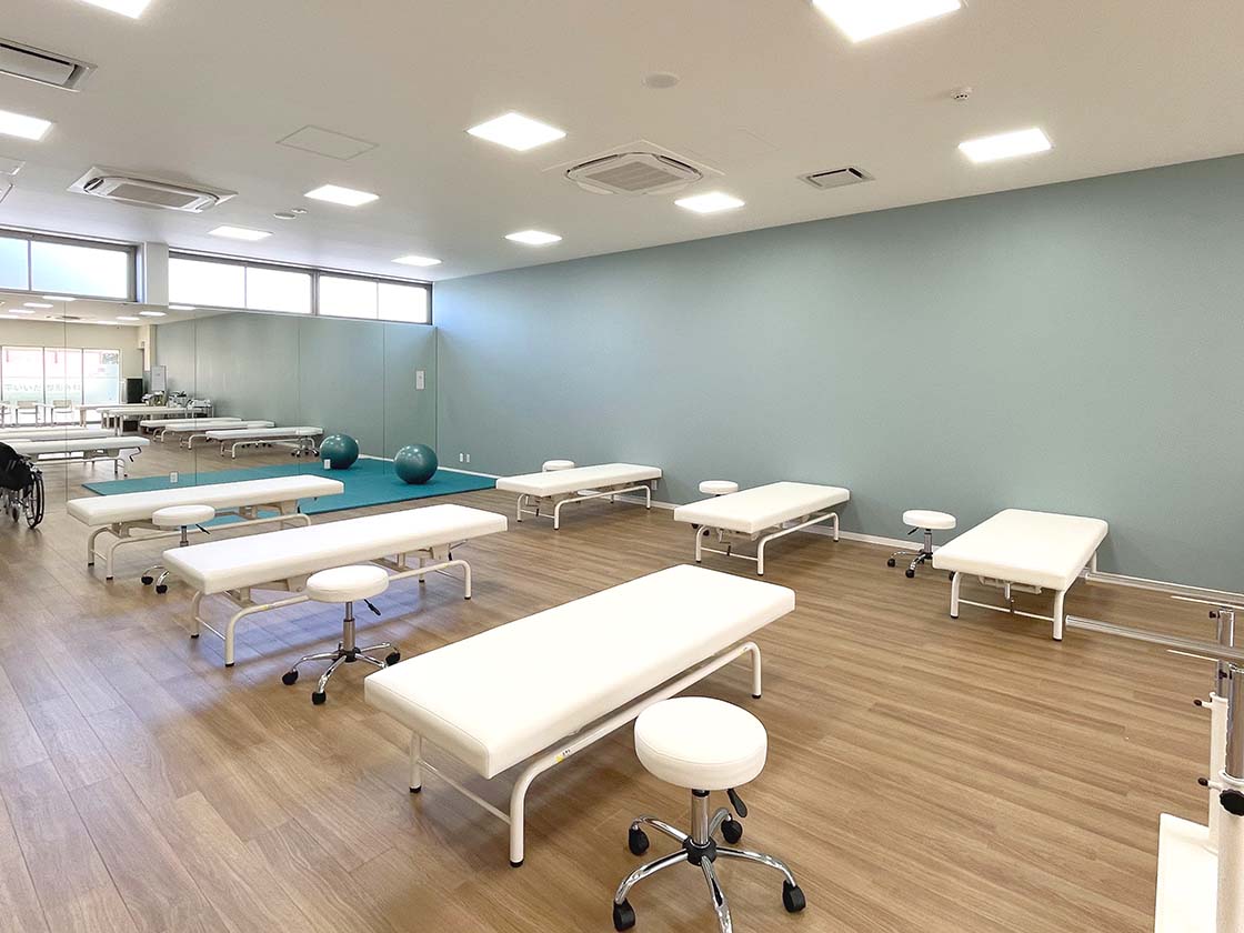一方、リハ室はモスグリーンを基調としたさわやかな空間となっています。