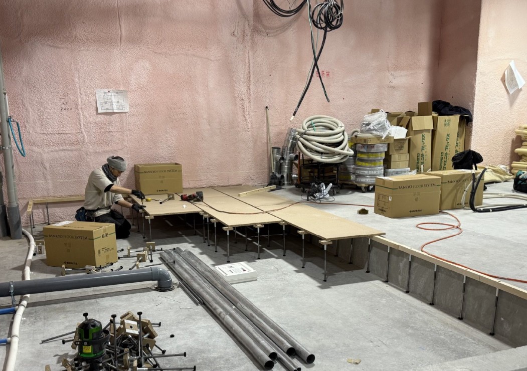 一定のピッチで支持脚を配置しながら、木質パネルを並べてゆきます。