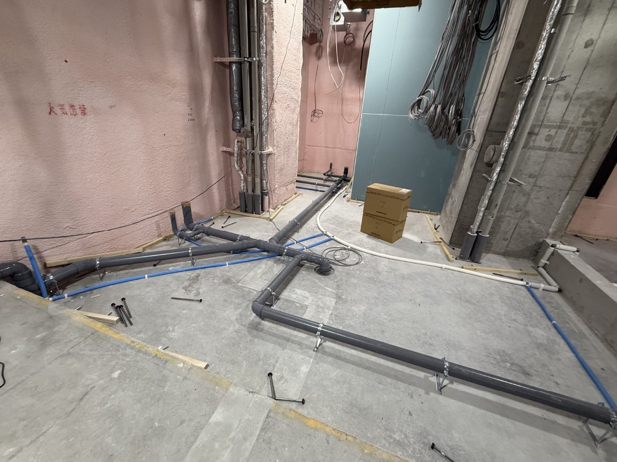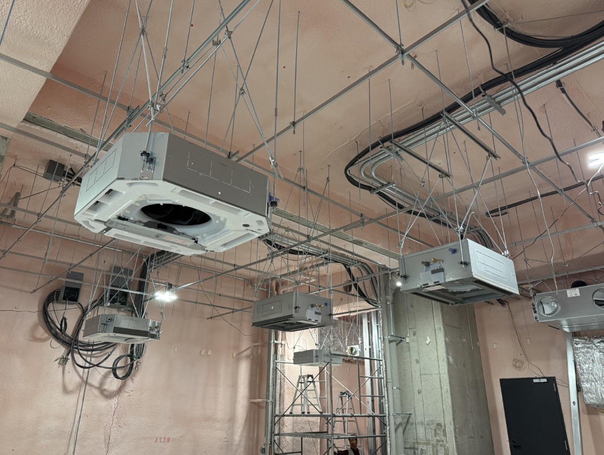 天井裏へ設備機器を設置するため、天井を解体してから空調機器や換気ダクトを吊り込んでゆきます。