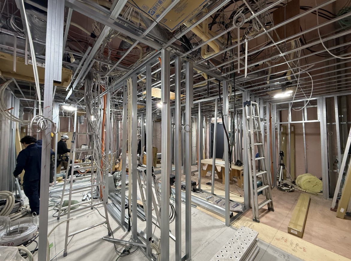 LGS(ライトゲージスタッド)と呼ばれる鋼製の骨組みを立て込んでゆきます。