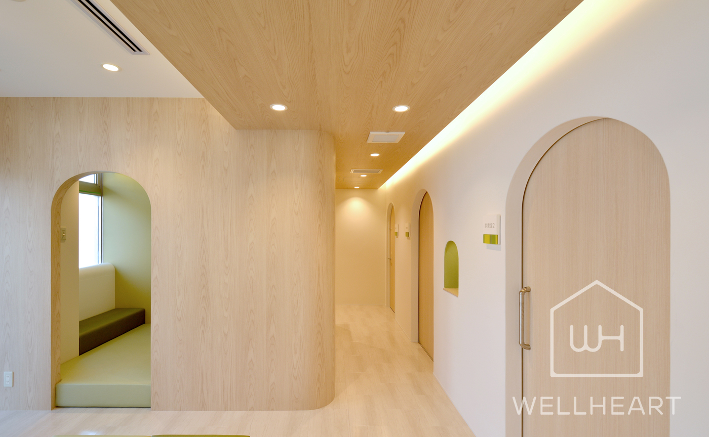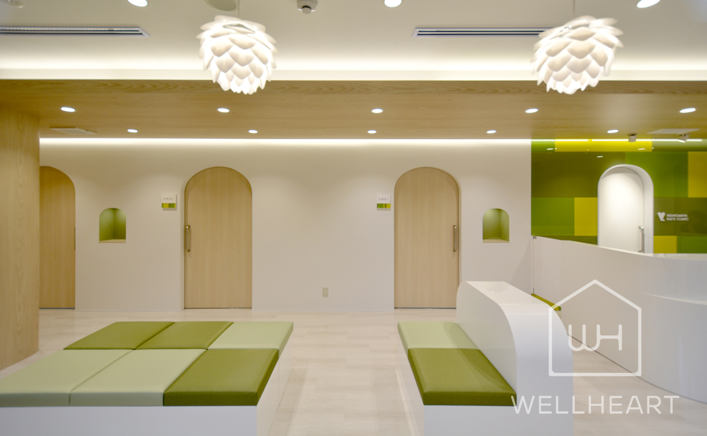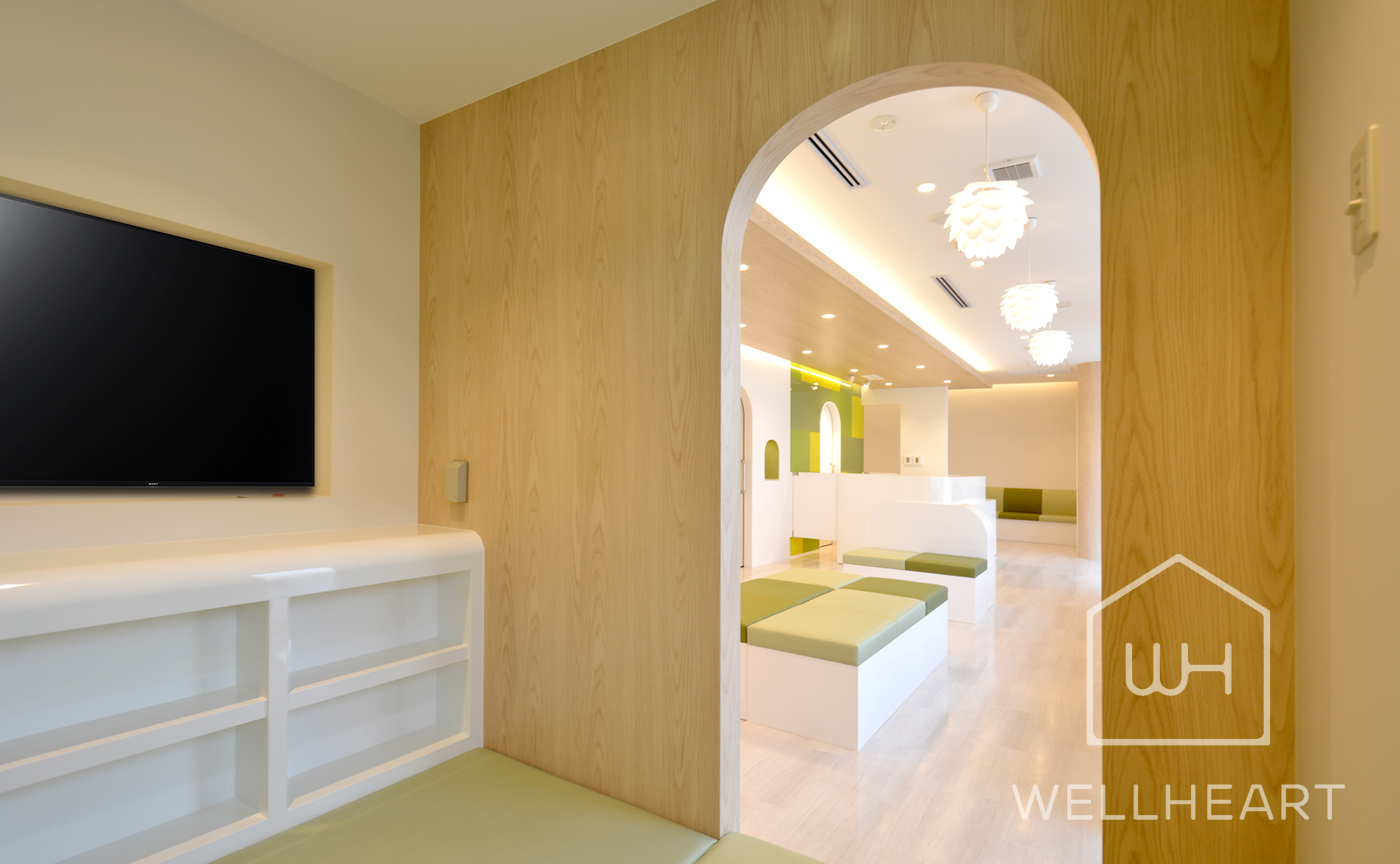 森の中をイメージして曲線やアースカラーを使いながら明るくて温かみのあるデザインとしました。 待合室の壁面は珪藻土で仕上げられており、優れた調湿効果を発揮しながら、柔らかい印象を与えています。