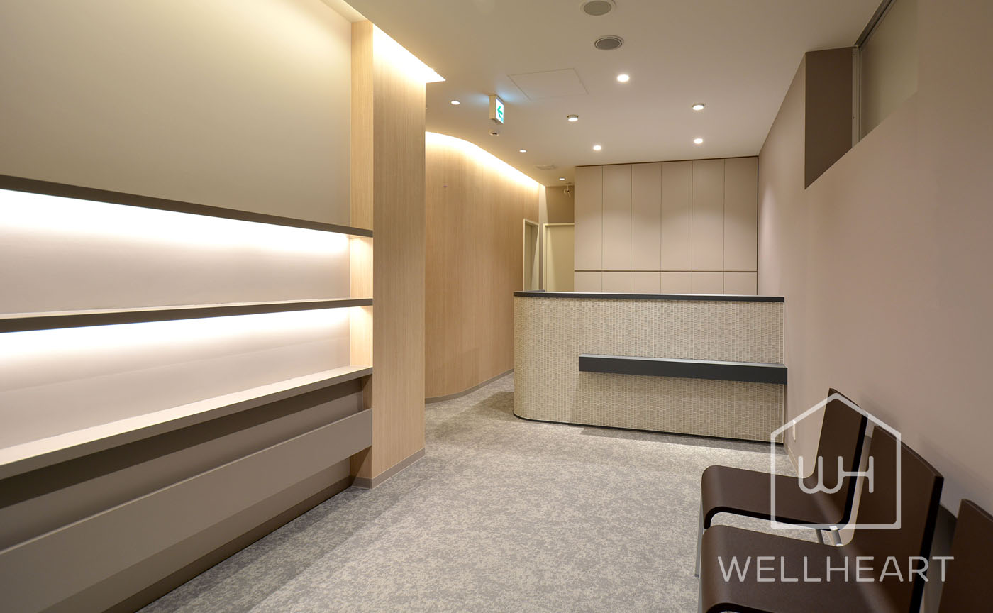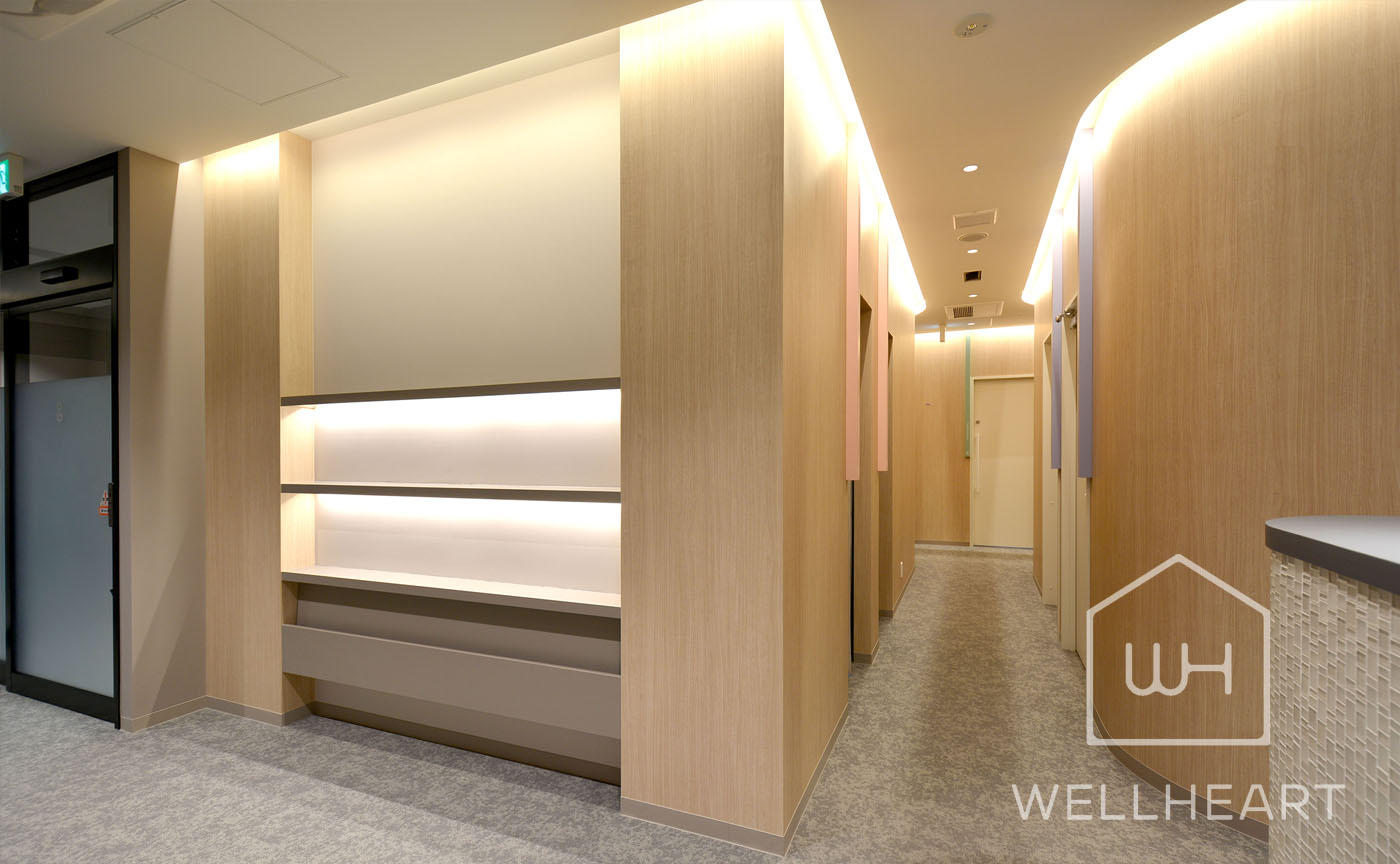 全体的にスモーキーな淡いトーンのカラーで統一することによって、優しいながらも落ち着いた空間になっています。また、特徴な曲面の壁前は動線のスムーズさと意匠的な効果をもたらせています。