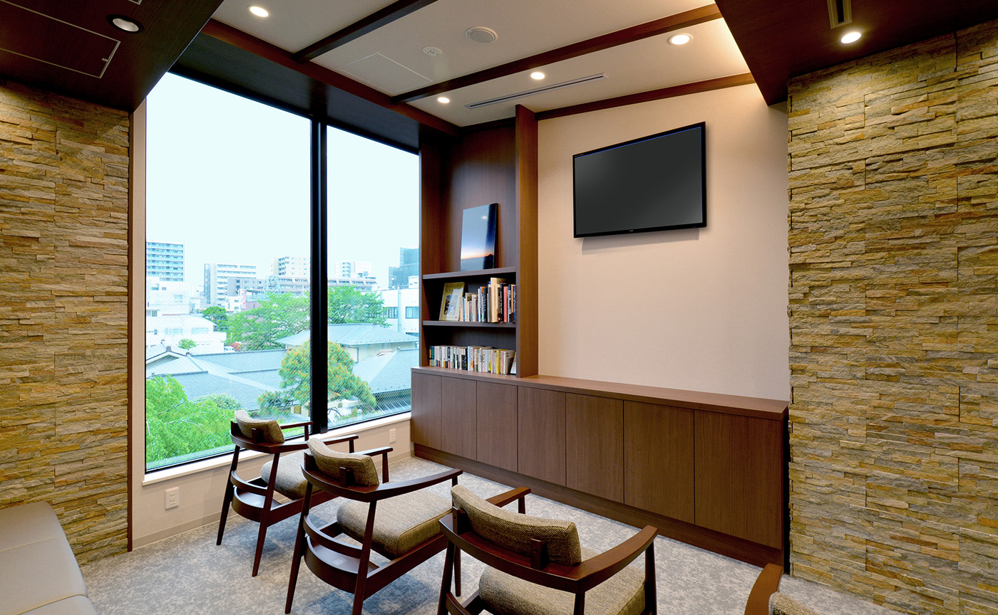 石タイルや化粧梁による彫りの深いデザインが独特の落ちついた空間を作りだしています。 診察室も同様のデザインを踏襲し統一感を持たせています。