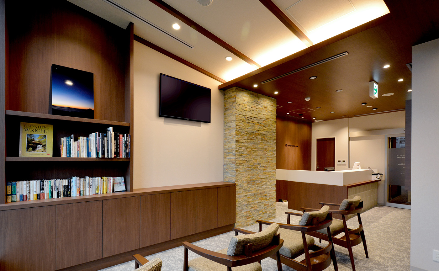 帝国ホテルを設計したことでも知られるアメリカの有名な建築家、フランクロイドライト。 彼の設計する美しい建築の数々、その空間のエッセンスを少しでも取り入れたいと思いながらデザインしました。(もちろんドクターのご希望を踏まえて。)