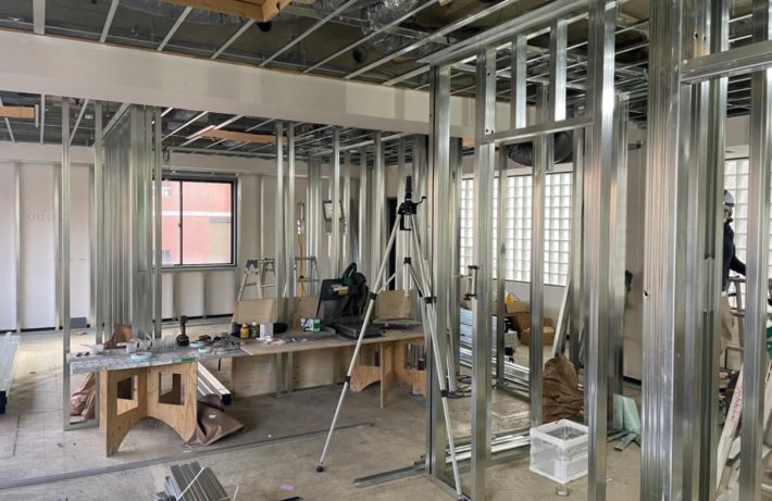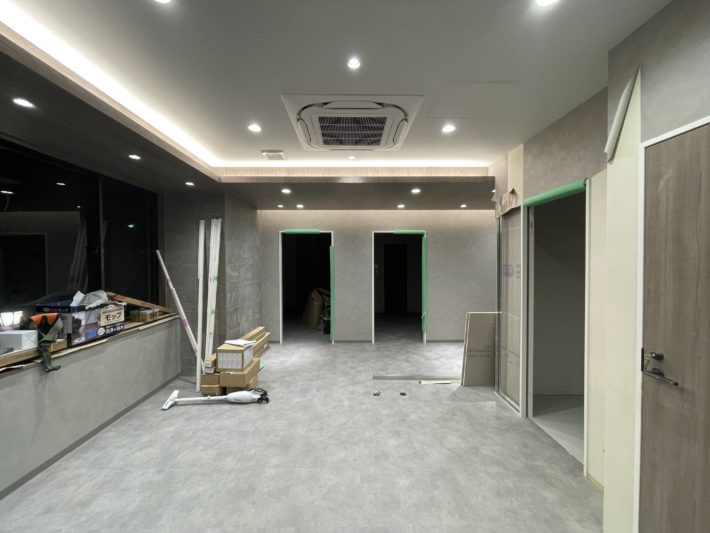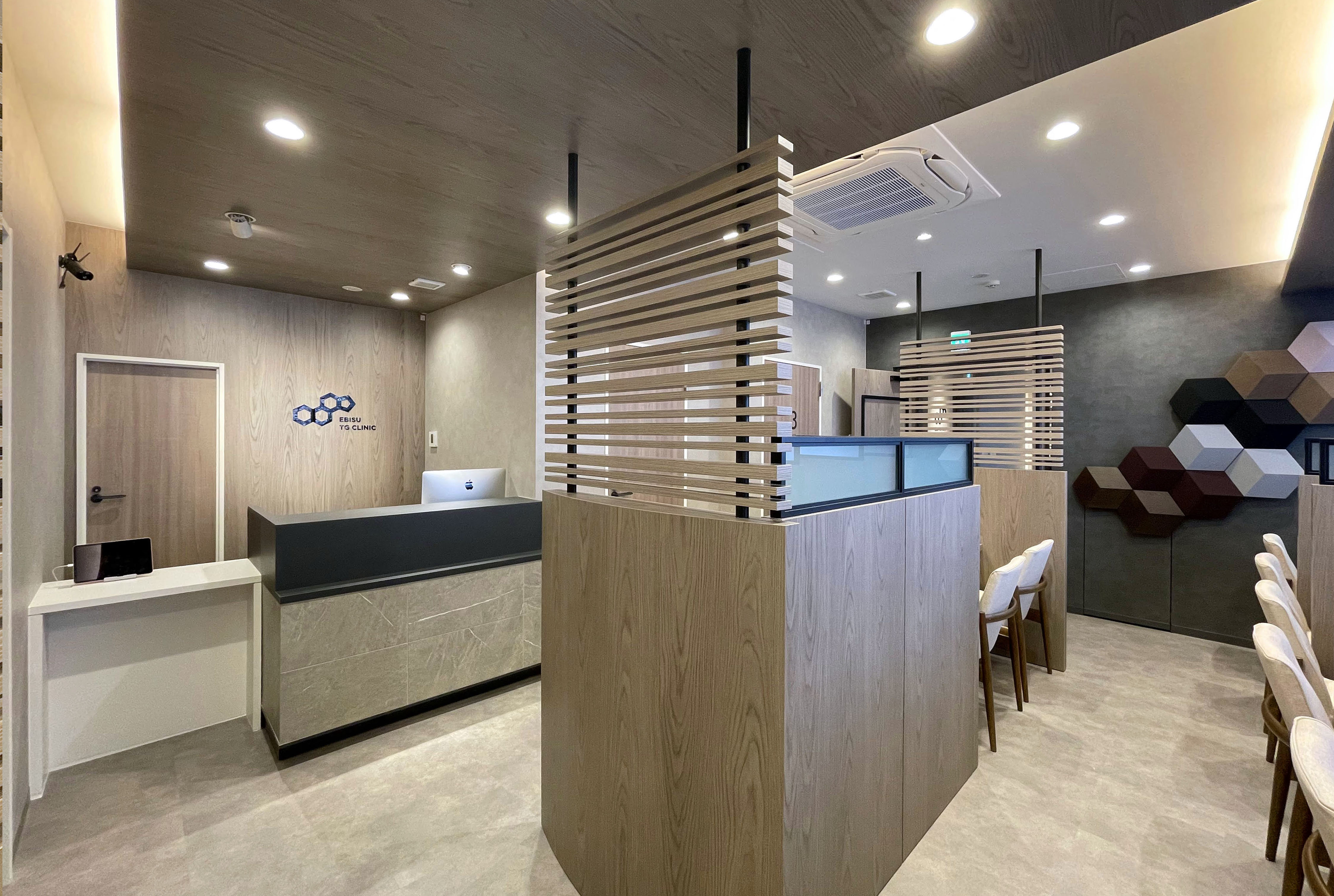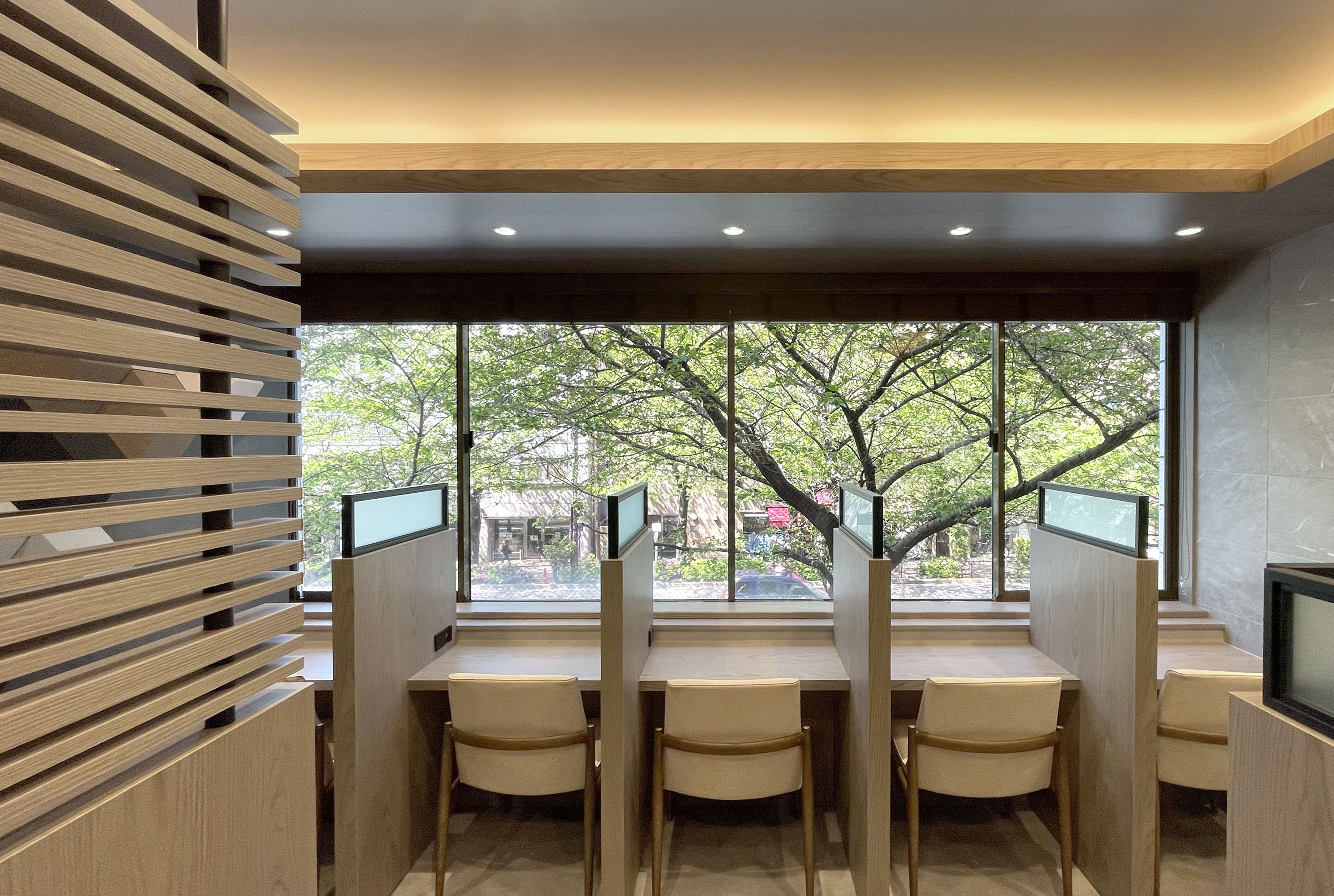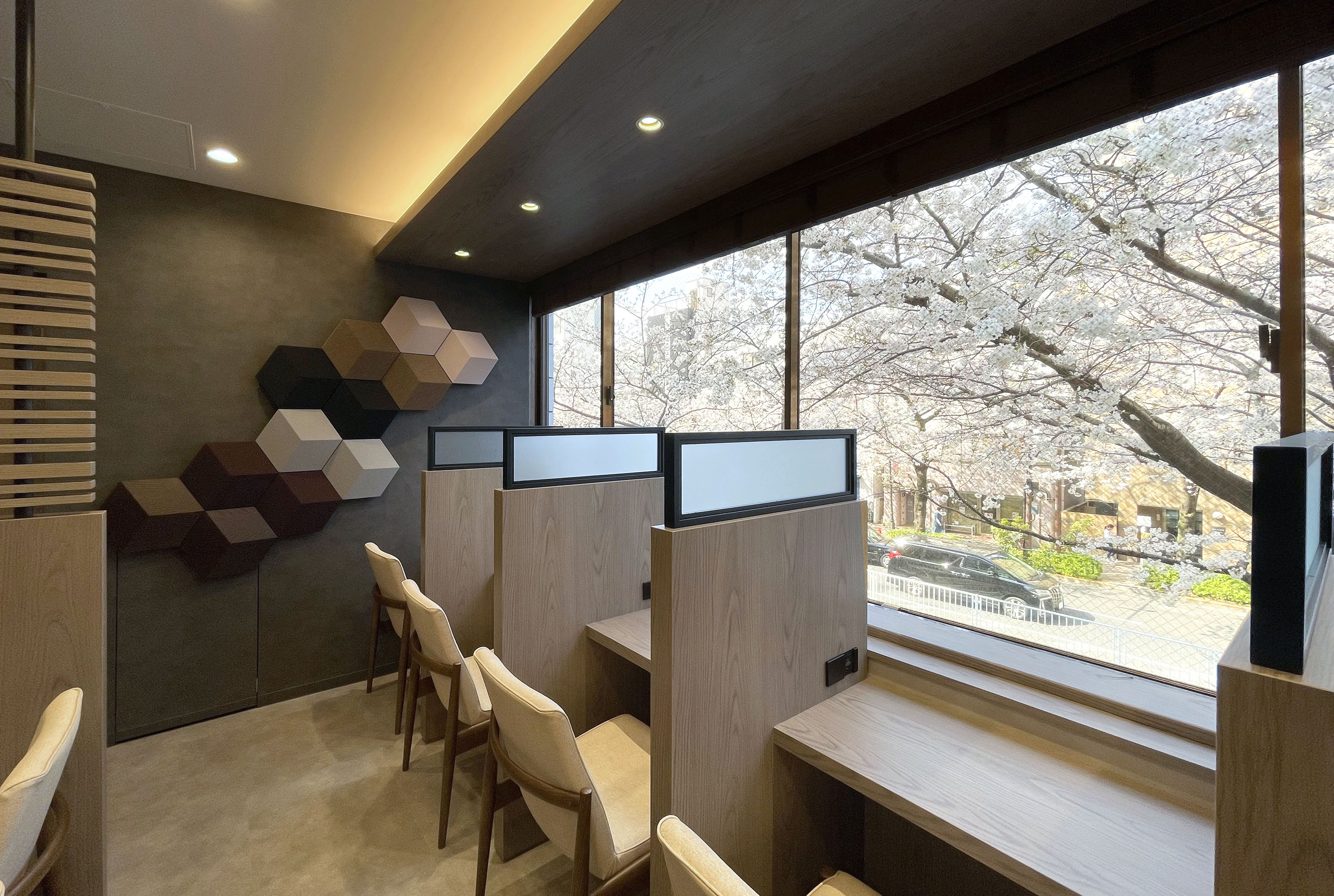 トランスジェンダーの方々を専門としたクリニックです。主にホルモン治療を中心とした診療を行っています。診療内容の特性上、プライバシーに配慮した空間づくりが必要でした。 幸いにも前面道路に美しい桜並木があり、そこに大きく開けた窓があったため、一人ずつ座れるカウンターを用意して居心地のよい待合ブースを作ることが出来ました。 そのほかにも格子パーティションやスモークガラスなどを使用し、閉鎖的な印象を与えないようにプライバシー確保の工夫を行っています。