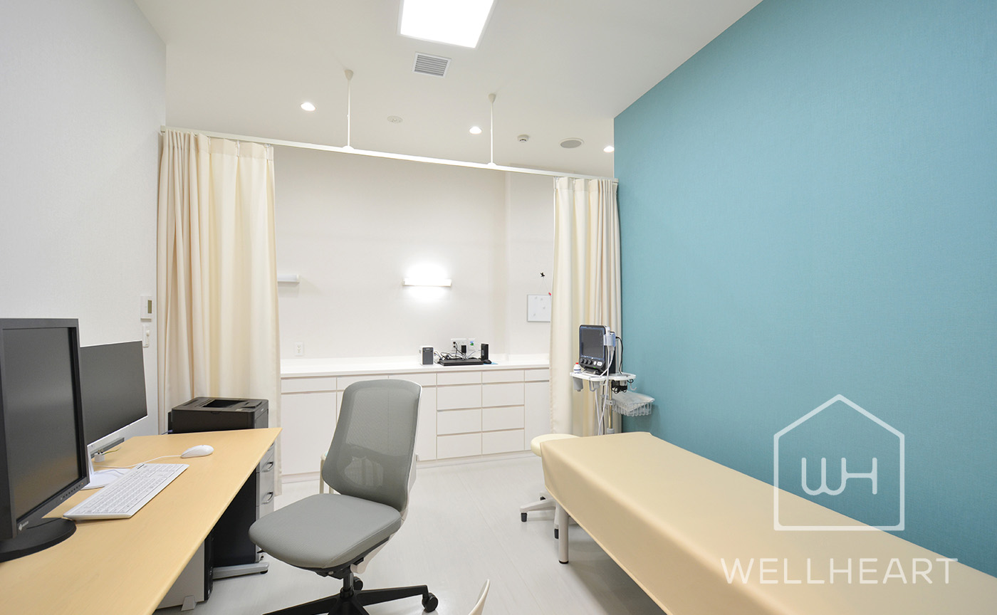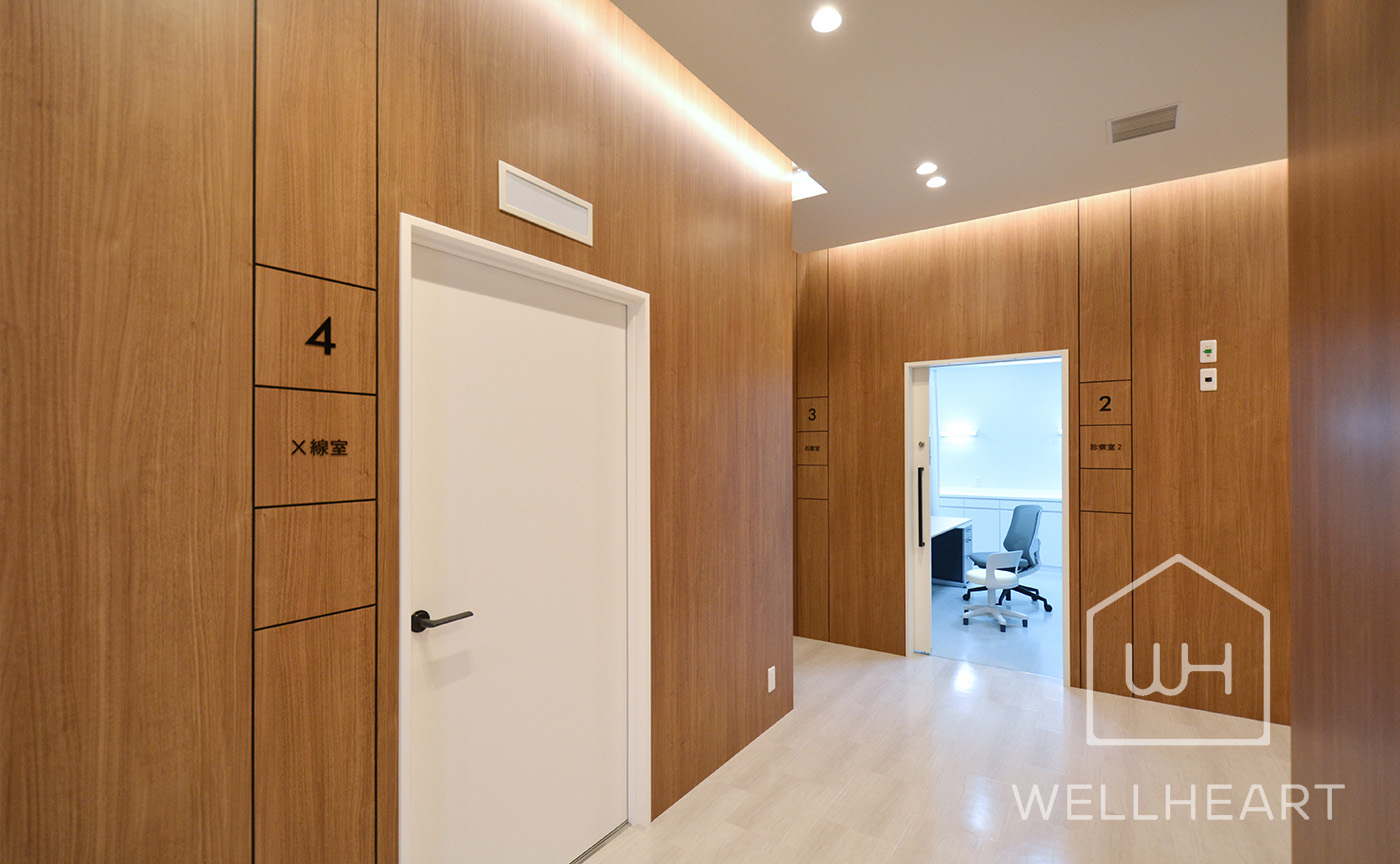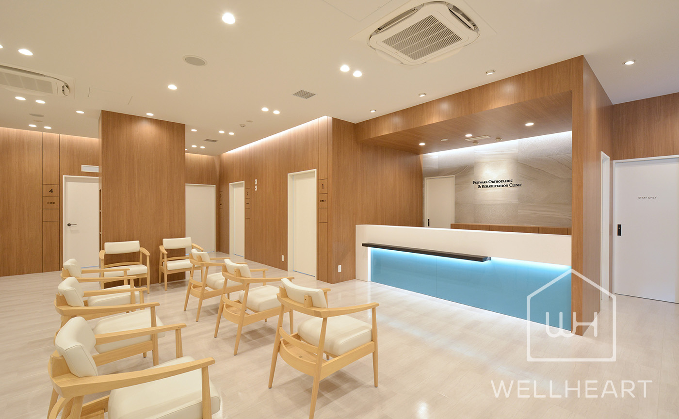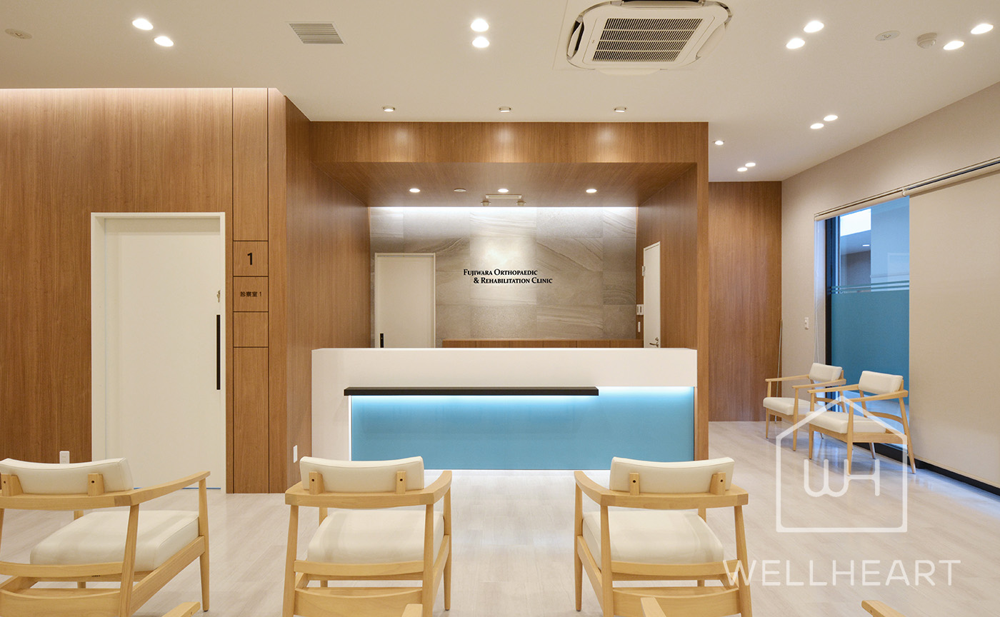 瀬谷駅前のロータリーに面した好立地の整形外科です。 ミディアムブラウンの木目の壁面にドクターが好きなカラーであるターコイズブルーを差し色として配色することによって遊び心のある内装デザインになっています。 コロナ対策としても重要な換気環境を効率的にするためにロスナイ換気を採用しています。
