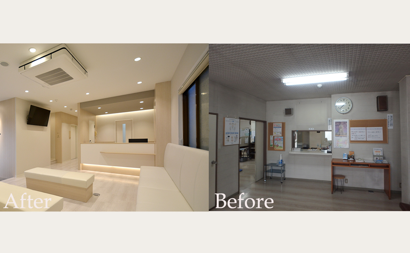足立区の青井のある内科クリニックのフルリフォームです。これまで待合・診察・検査・トイレのスペースがしっかり区切られておらず、プライバシーの確保が不十分だったため、今回のリフォームでしっかり各スペースを区画しました。